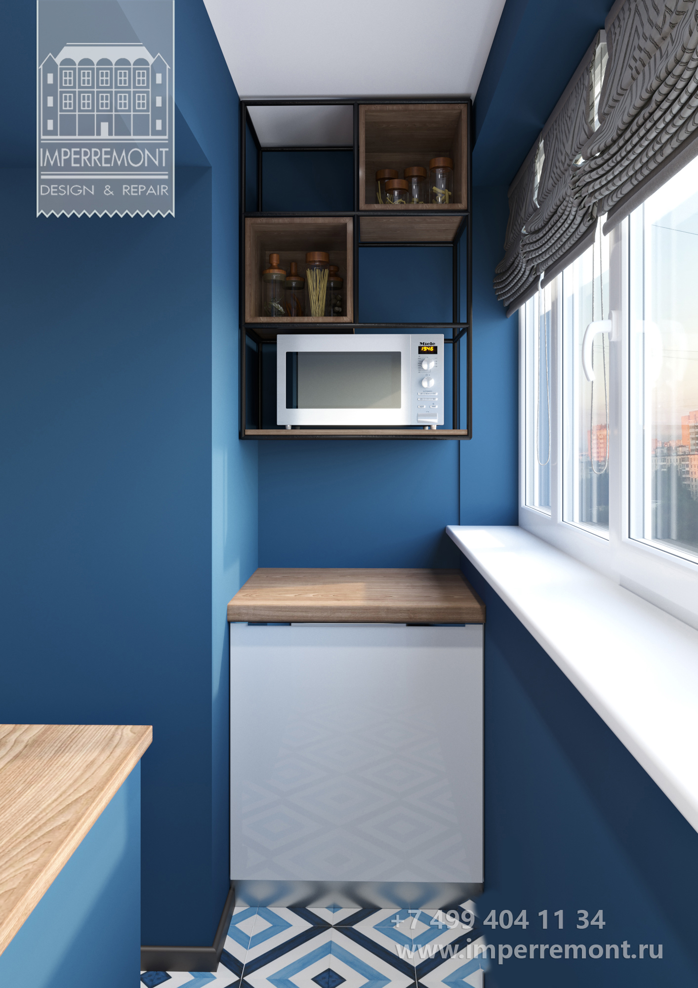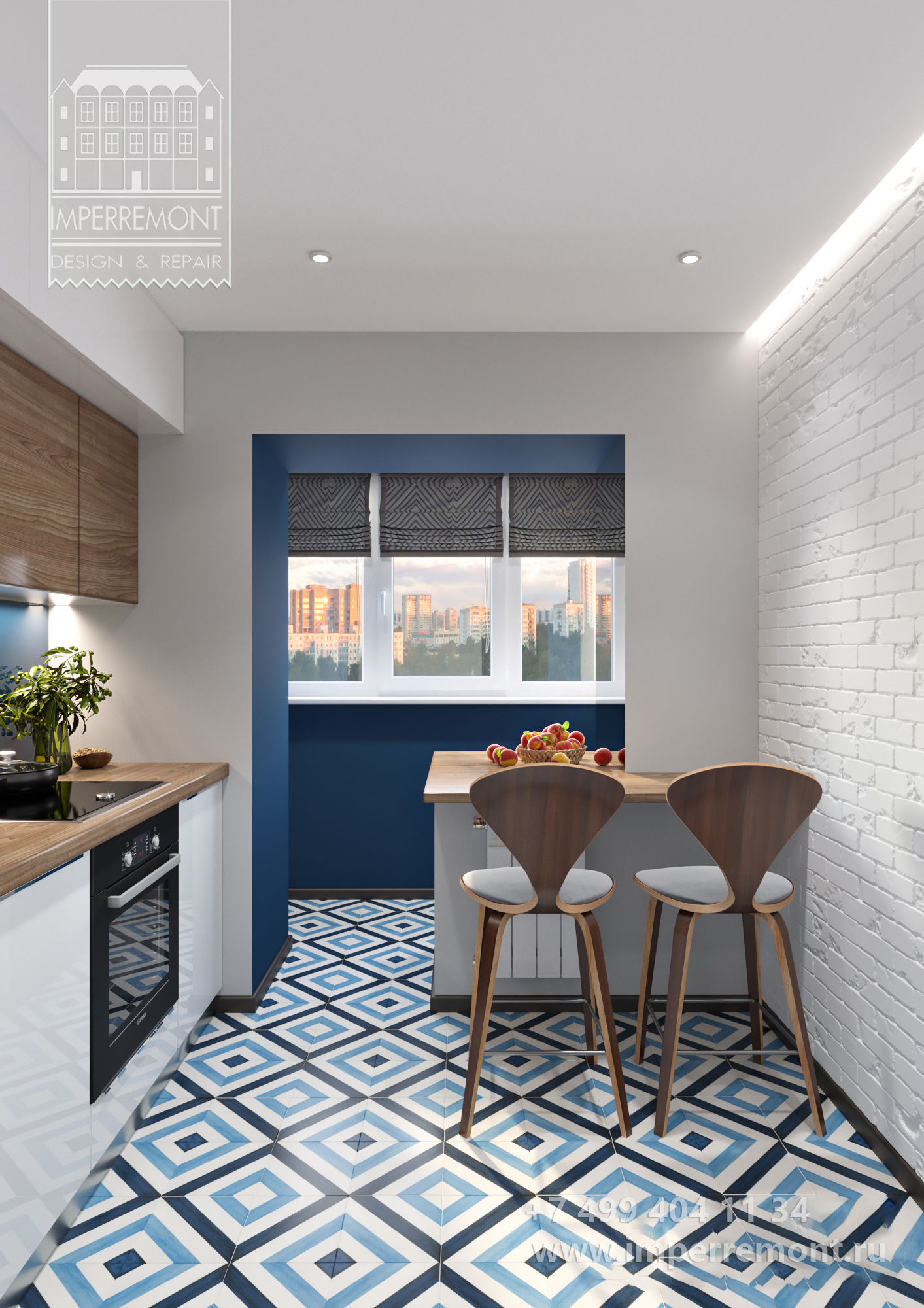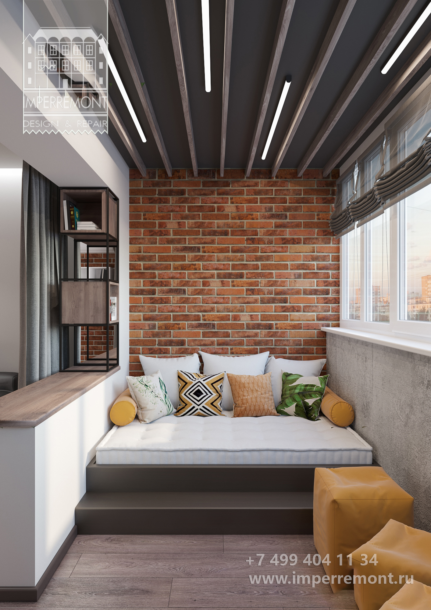 Позитивный интерьер с кухней на лоджии и зоной для релакса в 2-комнатной квартире